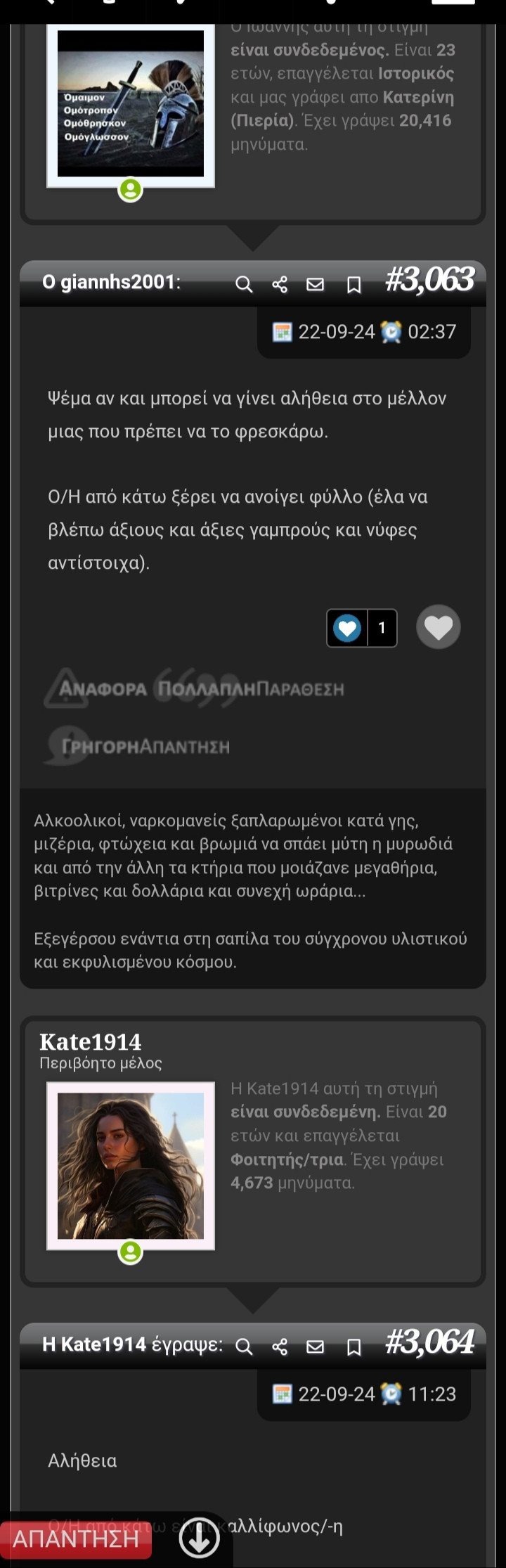 Η Kate1914 αυτή τη στιγμή είναι συνδεδεμένη. Είναι 21 ετών και επαγγέλλεται Φοιτητής/τρια. Έχει γράψει 7.397 μηνύματα.