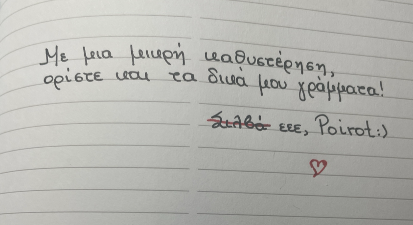 Τυχαίνει να μου λένε για τα γράμματά μου και επιτηρητές σε εξετάσεις, και στις Πανελλήνιες και στη σχολή. Ευτυχώς βλέπουν τις πρώτες σελίδες που είναι ακόμα ωραία, γιατί όταν φτάνω προς την 7η σελίδα απαντήσεων αρχίζει να πέφτει κάπως η ποιότητά τους...