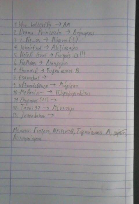 Πρέπει να είναι η πρώτη φορά που η δολοφονία είχε στόχο εμένα και στα 4 Παλέρμο, που έχω συμμετάσχει. Και συνήθως από την ψηφοφορία και στα τέσσερα παιχνίδια την γλίτωνα.Για τη Νεφέλη (γιατρός): χθες όντως το θύμα μας ήταν ο Πάι και τον έσωσες. Ήταν ομολογουμένως απόπειρα δολοφονίας με αρκετά μεγάλη πιθανότητα αποτυχίας... Πήρα που λέτε χθες αποφασιστικά τετράδιο και μολύβι και αφού είχαμε κάρτα όνειρο λέω μέσα μου: "τέλος, θα βρω τον γιατρό και θα τον φάμε!". Ε, πολλοί ρόλοι ήταν γνωστοί. Βρήκα τη drama από τα ποστς της που ανέφερε συνέχεια τον δήμαρχο, βρήκα τον Σπυράκο ως συγκάτοικο από μια ψηφοφορία που είχε συμμαχήσει με τον Θωμά και σε γενικές γραμμές με την μέθοδο του αποκλεισμού κατέληξα σε Ιορδάνη και Νεφέλη με επιφύλαξη. Ρωτήσαμε για τη Νεφέλη και χτυπήσαμε διάνα. Να και η λίστα που είχα κάνει με τους παίκτες (το έκαψα!) :